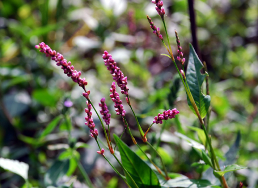 여름철에는 작고 흰색 또는 분홍빛을 띤 꽃이 피며, 그 꽃은 잎겨드랑이에 작게 모여 피어납니다.