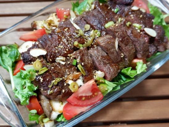 - 조립: 큰 볼에 채소를 담고, 구운 스테이크를 슬라이스하여 올립니다. 준비한 드레싱을 뿌려 고루 섞어줍니다.